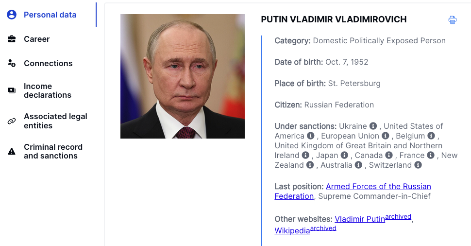 On the left, the sections of information on this page are listed. On the right are listed alternative spellings for the PEP's name. In the centre, the sanctions information is well curated: It includes a last checked date, and hyperlinks to sources: