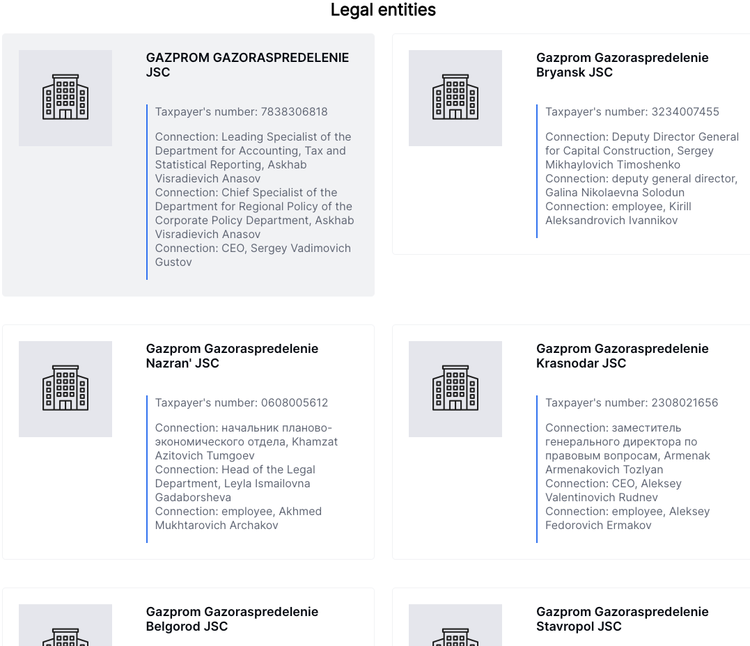 You can also search RuPEP for legal entities (companies and organisations). Here are some of the results for a search on Gazprom: