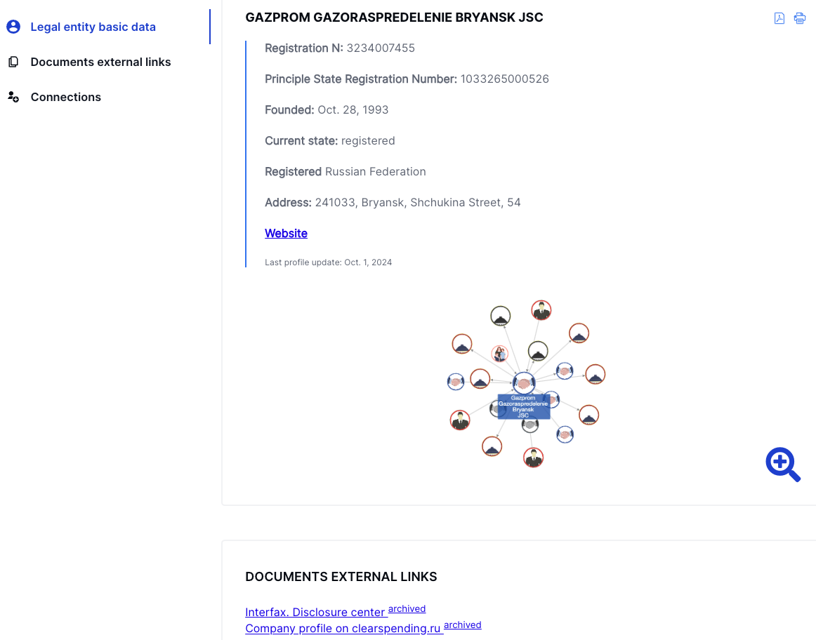 <figure><img src="https://1607018381-files.gitbook.io/~/files/v0/b/gitbook-x-prod.appspot.com/o/spaces%2FFuL0vtRVpXHiKZgFkMFR%2Fuploads%2Fgit-blob-a8ff3df6db14c2a1a408aa7fe68b915997716198%2FScreenshot%202024-10-02%20at%2009.29.10.png?alt=media" alt=""><figcaption><p>Legal entity search results for a search for Gazprom</p></figcaption></figure>