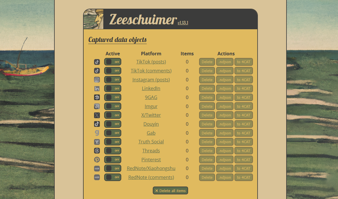 Installing and using Zeeschuimer does **not** require any programming knowledge. Once the extension is installed, an icon appears in your browser toolbar. Clicking it opens the Zeeschuimer interface, where you can select which sites to capture data from. You then simply browse those sites normally. The extension will show a running count of how many posts/items have been detected for each platform as you scroll. When you’re finished, you can save the collected data. **Export options** include downloading an `.ndjson` data file to your computer or sending the data directly to a 4CAT server to create a ready-to-analyze dataset. ([4CAT](https://4cat.nl/), short for *Capture and Analysis Toolkit*, is an open-source platform for analyzing social media data – Zeeschuimer was designed to feed into it, though using 4CAT is optional.)